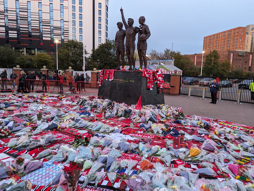 Já dentro do estádio, mais uma homenagem foi prestada ao internacional inglês. Uma bonita homenagem nasce vinda do túnel de Old Trafford, quando surge Ten Hag como uma coroa de flores para o relvado, depois de ambos os conjuntos de jogadores já terem chegado ao centro do campo antes do pontapé de saída para fazer parte de um minuto de silêncio. Liderado por gaitas de foles, Ten Hag foi acompanhado pelo capitão da equipa juvenil do United, Dan Gore, e pelo antigo guarda-redes do United, Alex Stepney, que venceu a Taça dos Campeões Europeus ao lado do Charlton.