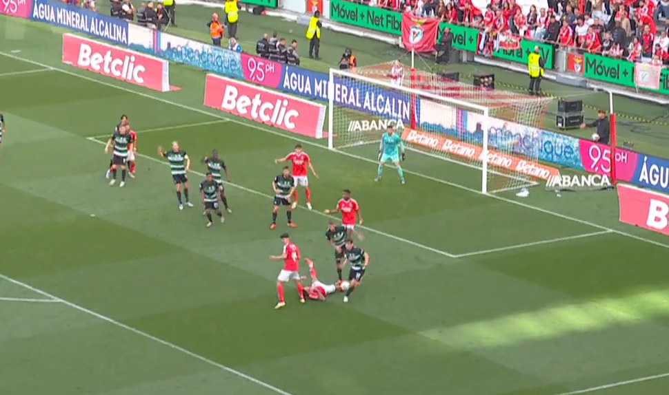Lance polémico na Luz no dérbi entre Benfica e Sporting, aos 25 minutos. Otamendi caiu na área e ficou a pedir grande penalidade por alegada falta de Debast. O árbitro João Pinheiro nada assinalou e o VAR optou por não intervir.
