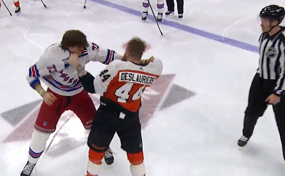 Matt Rempe e Nicolas Deslauriers envolveram-se numa luta no duelo entre New York Rangers e os Philadelphia Flyers