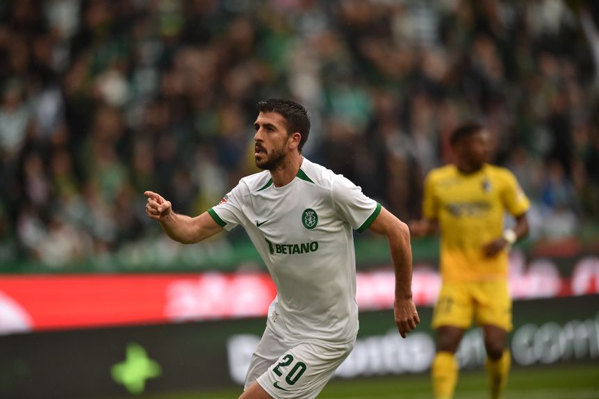 A receção de Nuno Santos é muito boa, o cruzamento da esquerda também e Paulinho remata de primeira, de pé direito, e faz o 1-0 para o Sporting.