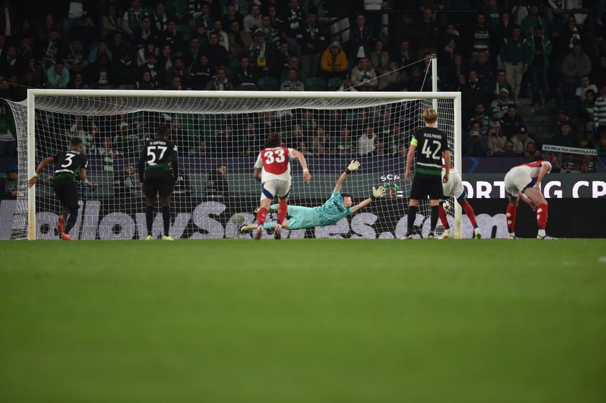O Arsenal chega ao quarto golo em Alvalade numa grande penalidade convertida por Bukayo Saka, a castigar falta de Diomande sobre Odegaard dentro da grande área dos leões.