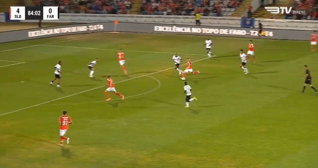 Boa jogada desenhada pelos encarnados, com Rollheiser a receber a bola, a galgar metros até à entrada da área e a rematar sem hipóteses para o guarda-redes do Farense.
