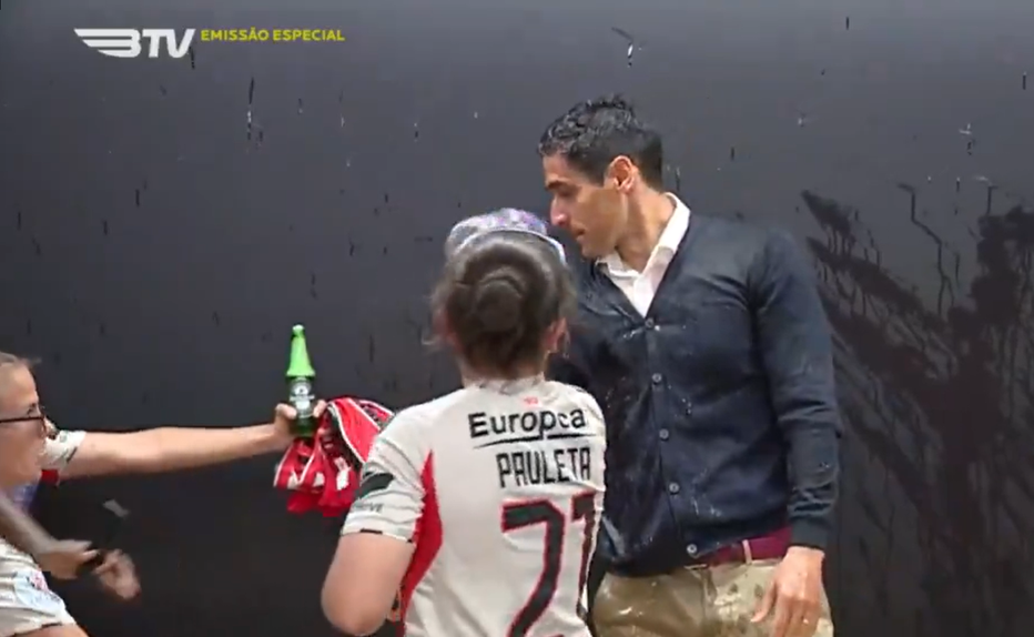 VÍDEO: treinador do Benfica levou banho das jogadoras na festa do título... e não gostou