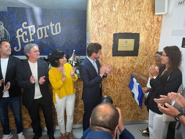 Ladeado de Cristina Saavedra, responsável pela delegação azul e branca na Serra da Freira, o presidente da SAD dos dragões descerrou a bandeira do clube que estava por cima da placa referente à efeméride, momento que mereceu, naturalmente, muitos aplausos por parte de todos os presentes.