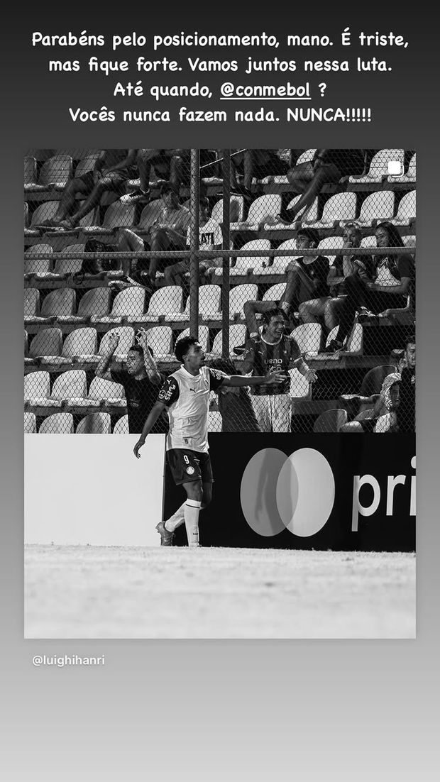 «Parabéns pelo posicionamento, mano. É triste, mas continua forte. Vamos juntos nessa luta. Até quando, CONMEBOL? Vocês nunca fazem nada. Nunca!», exclamou o astro brasileiro, em história publicada nas redes sociais.