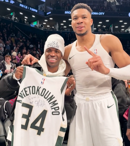 Num vídeo partilhado nas redes sociais, o basquetebolista dos Bucks brinda Vini Jr. com um par de ténis, antes de tirar a camisola e oferecer o «pacote completo» àquele que considera «o jogador brasileiro número 1 a nível mundial».