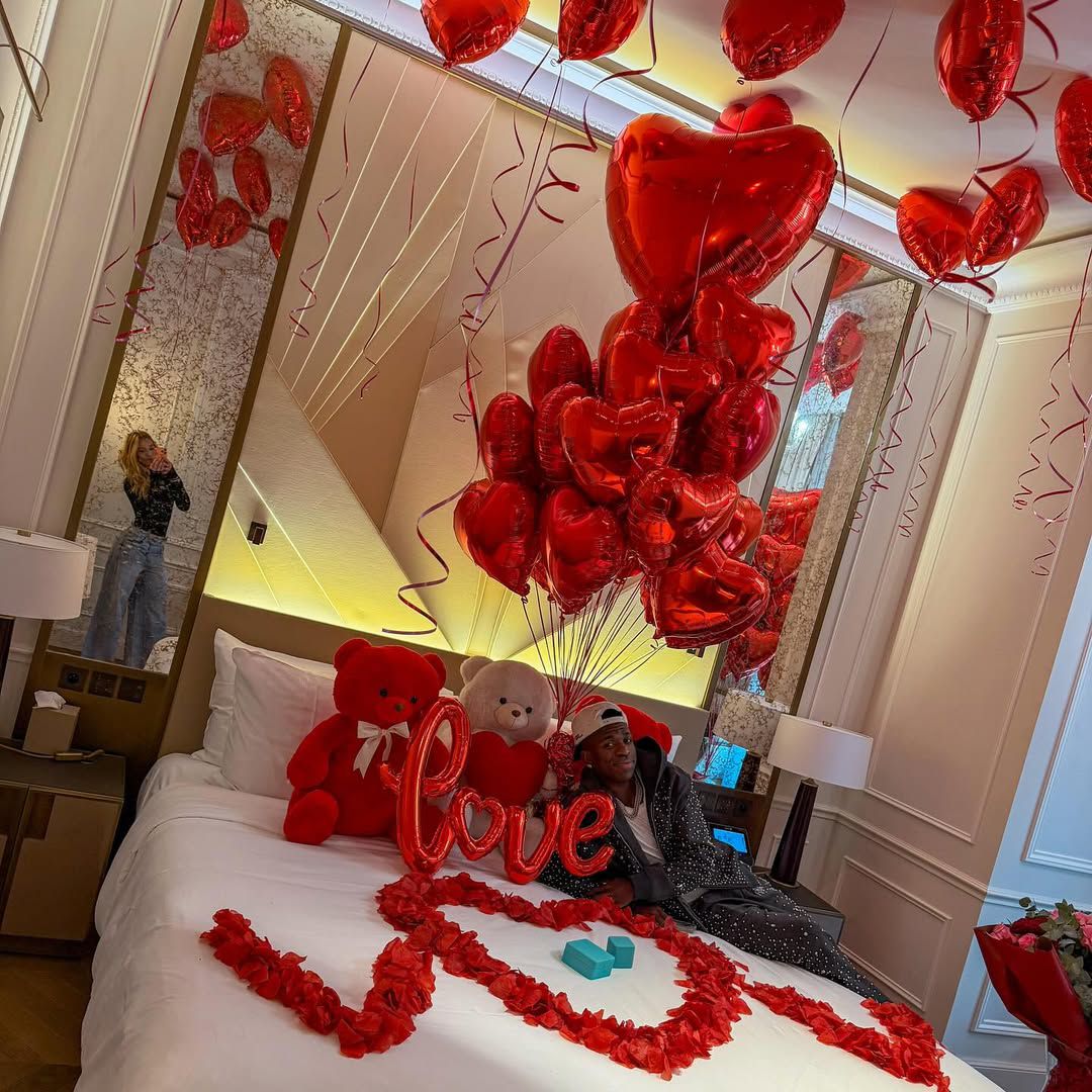 Agora os dois fotografaram-se num quarto com a cama decorada com pétalas de flores em forma de V e balões com a palavra 'love', com duas caixas de joias em cima da cama.