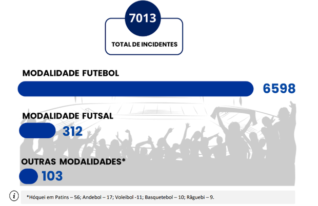 Relativamente à distribuição por modalidades, a maioria dos incidentes foi registada, sem surpreas, no futebol, com 6686 ocorrências, seguido do futsal, com 340 incidentes, e das restantes modalidades, que totalizaram 114 casos, destacando-se o hóquei em patins, com 61.
