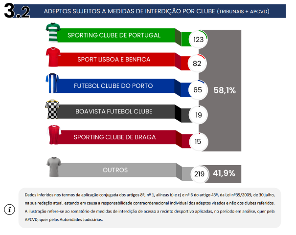 Quanto à distribuição de adeptos sujeitos a medidas de interdição por clube (tribunais + APCVD), verifica-se, igualmente sem surpresas, que os três grandes são os clubes mais representados, com o Sporting a liderar o ranking.