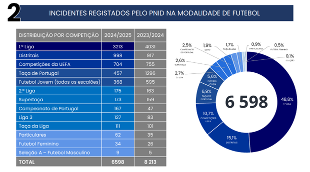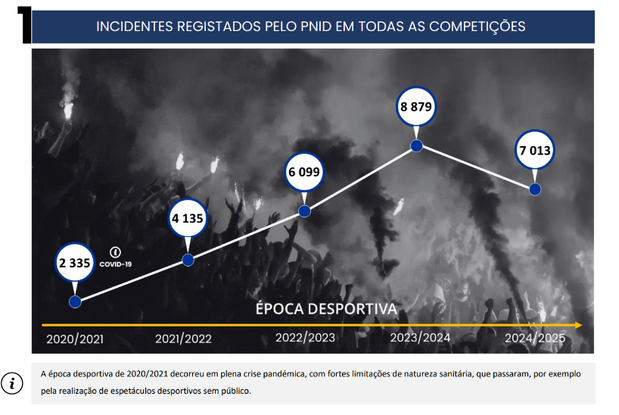 Esta quebra marca uma interrupção da tendência de crescimento verificada nos anos anteriores. Destaca-se, pelo segundo ano consecutivo, «a diminuição dos episódios de violência, nomeadamente agressões, incitamento à violência, racismo, xenofobia e outras formas de intolerância, refletindo o impacto positivo das estratégias preventivas e sancionatórias adotadas.»