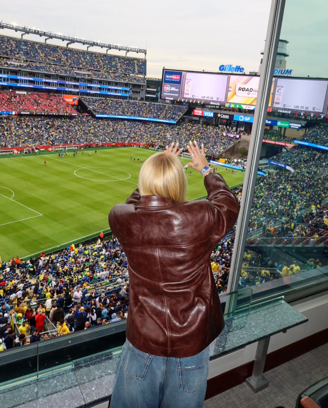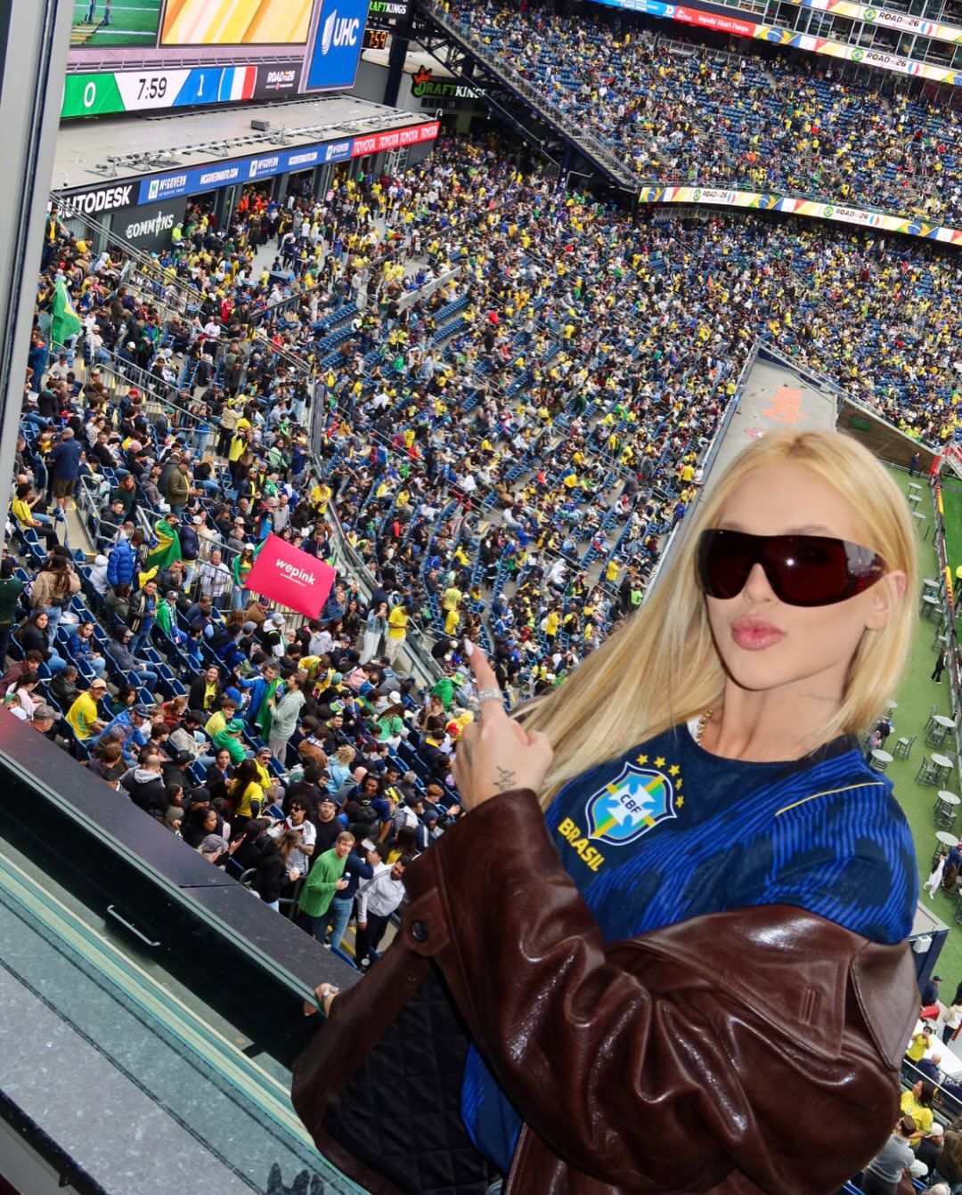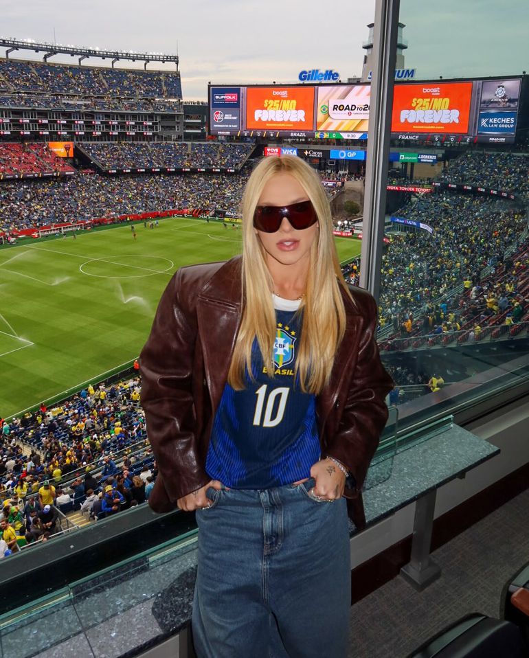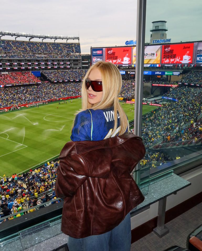 Virgínia, namorada de Vinícius Jr., marcou presença no Gillette Stadium, casa dos New England Patriots, da liga norte-americana de futebol americano (NFL), para assistir ao particular entre o Brasil e França, que os gauleses venceram por 2-1. Vestida a rigor, não poupou no apoio ao atacante canarinho.