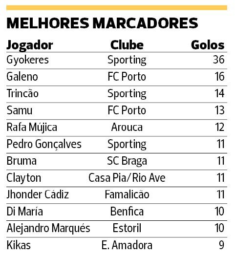 O pódio completa-se com dois jogadores que, mesmo não sendo pontas de lança, tiveram um ano muito profícuo: Galeno e Trincão. Significativa a presença de Pedro Gonçalves, que surge nesta lista pelo quinto ano consecutivo (!), mesmo tendo falhado sete das 16 jornadas de 2024/2025.