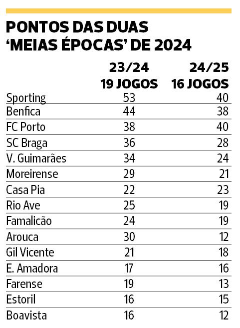 Com a diferença do número de jornadas cumpridas nas duas meias Ligas de 2024 (19 da época passada contra 16 da atual) é natural que, com menos nove pontos em disputa, as equipas apresentem inferior pontuação neste arranque de época.
