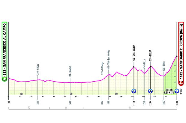 O segundo dia (150 km) acresce de dificuldade, com a chegada ao Santuário de Oropa, no topo de uma ascensão de 11,8 km (a uma inclinação média 6,2%) que, certamente, estabelecerá a primeira hierarquia entre os principais candidatos à camisola rosa final. E só à terceira jornada haverá um trajeto plano de predileção dos sprinters.