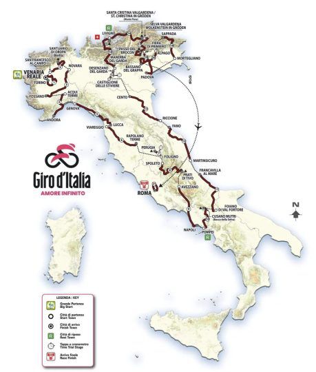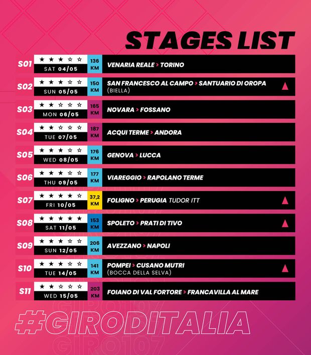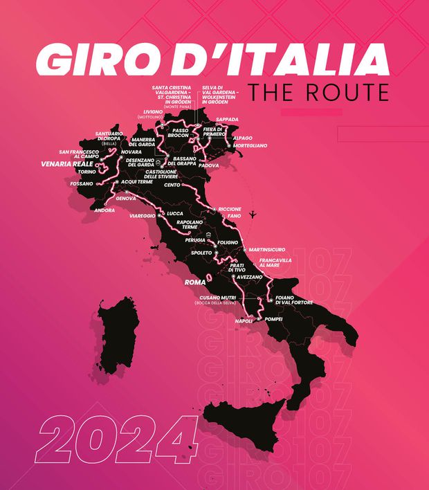 O 107.º Giro terá início a 4 de maio, sábado, desde logo com uma etapa montanhosa entre Venaria Reale e Turim, capital do Piemonte, e termina três semanas depois, domingo, 26 de maio, no final de uma etapa plana (21.ª) com partida e chegada em Roma.