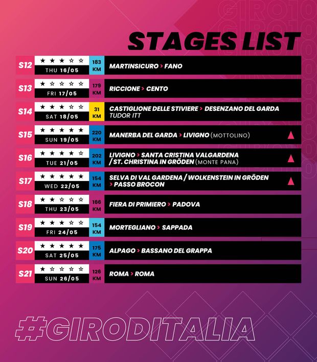 Seguem-se mais três etapas (17, 18 e 20) de enorme aparato montanhoso, a última, no penúltimo dia da competição, a culminar no Monte Grappa, a escalar duas vezes pelos corredores, e que antecederá a jornada de consagração com partida e chegada à capital Roma, à imagem da edição deste ano.