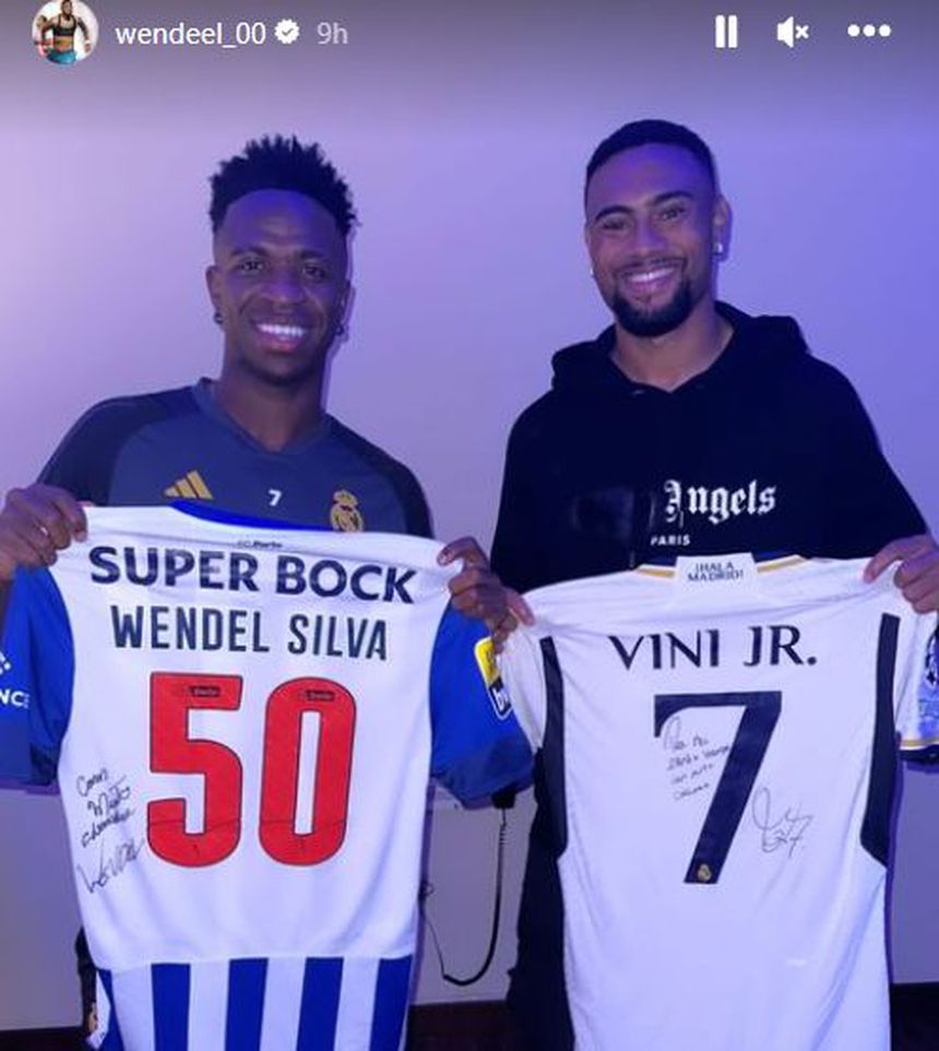 Os dois foram companheiros na formação do Flamengo - Wendel saiu em 2020 para o Leixões e Vini já tinha saído em 2018 para o Real Madrid Castilla - e aproveitaram o encontro para trocar camisolas.