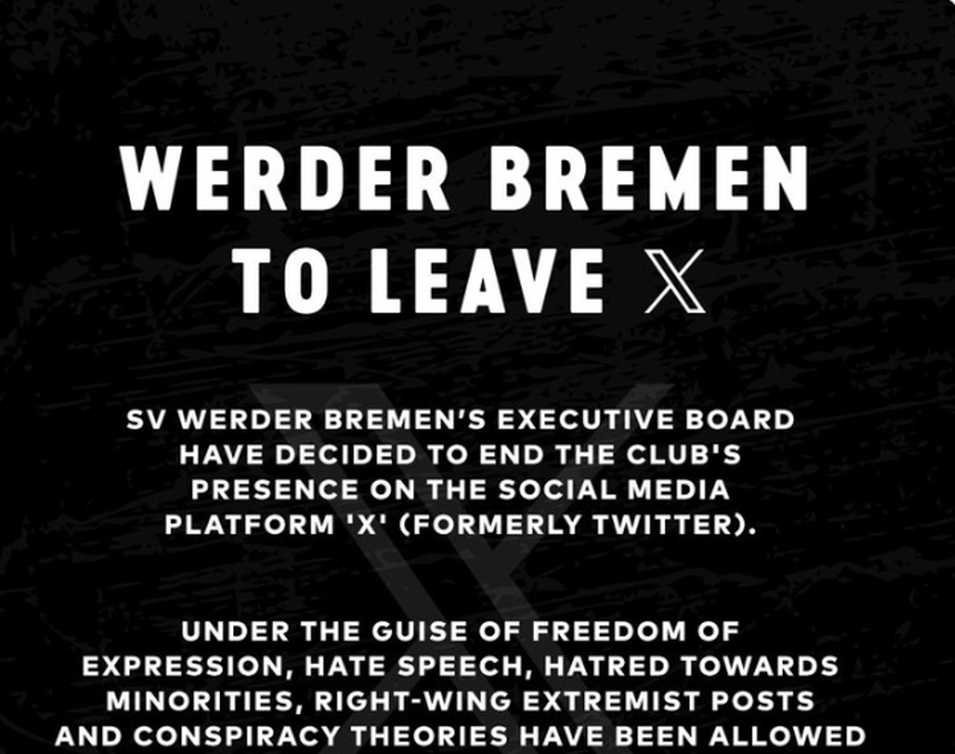 «O conselho de administração do Werder Bremen decidiu terminar com a presença do clube na rede social X (antigo Twitter). Sob o pretexto de liberdade de expressão, o discurso de ódio, o ódio contra as minorias, as publicações de extrema-direita e as teorias da conspiração aumentaram a um ritmo incrível», lê-se na publicação.