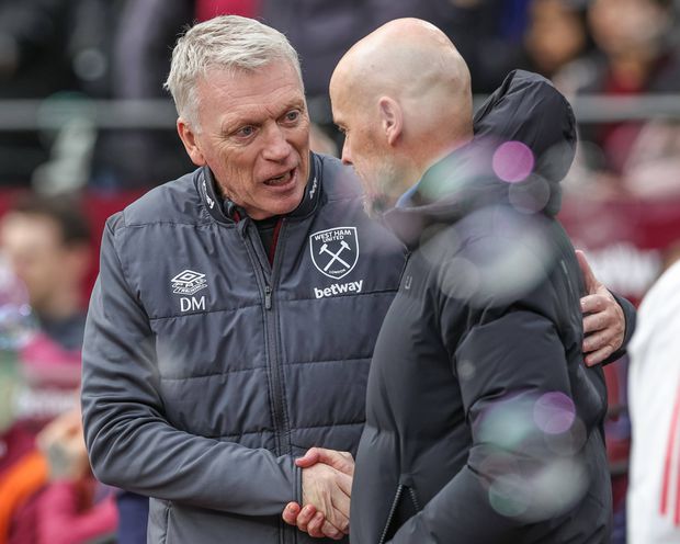 Cumprimento entre David Moyes e Erik Ten Hag.
