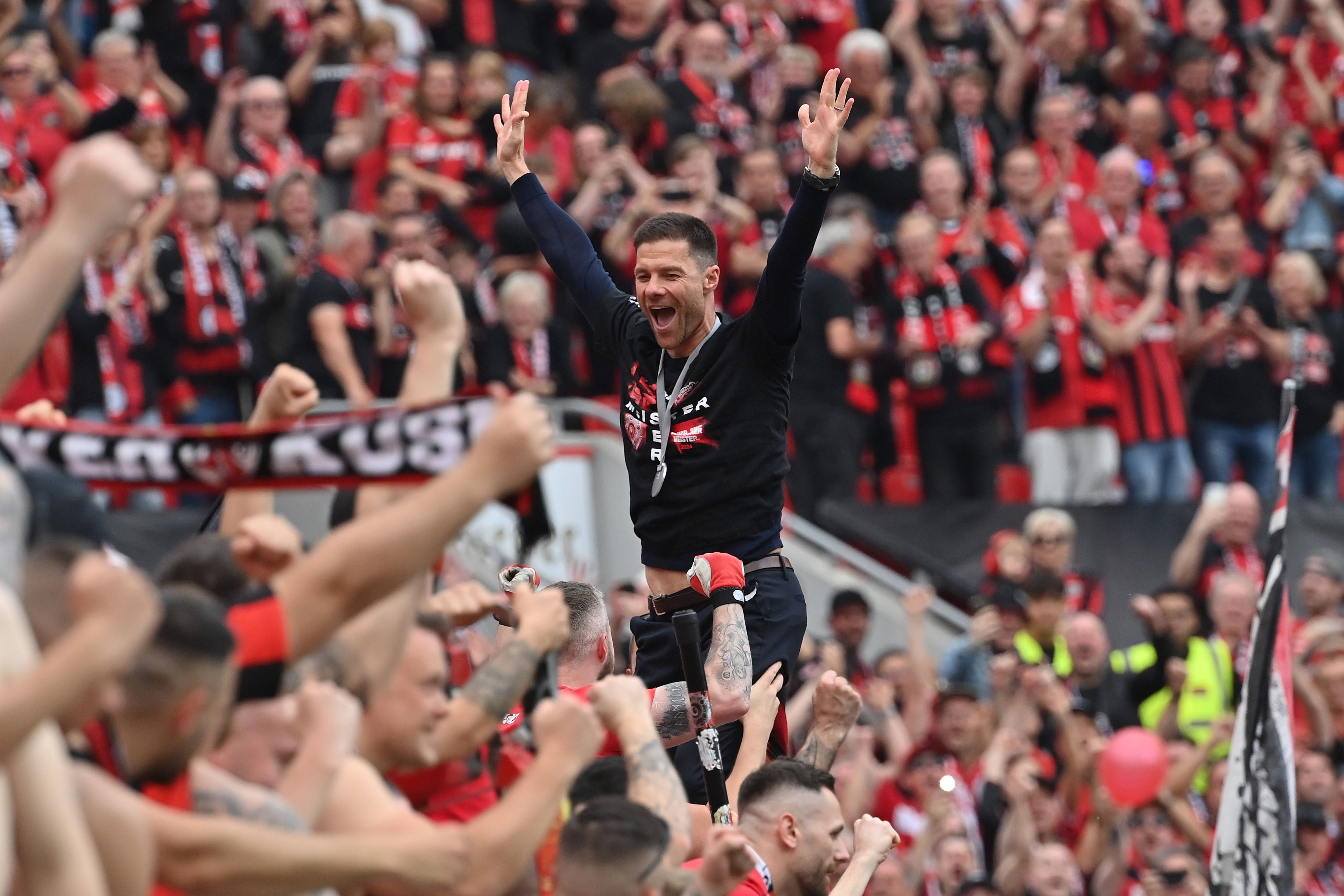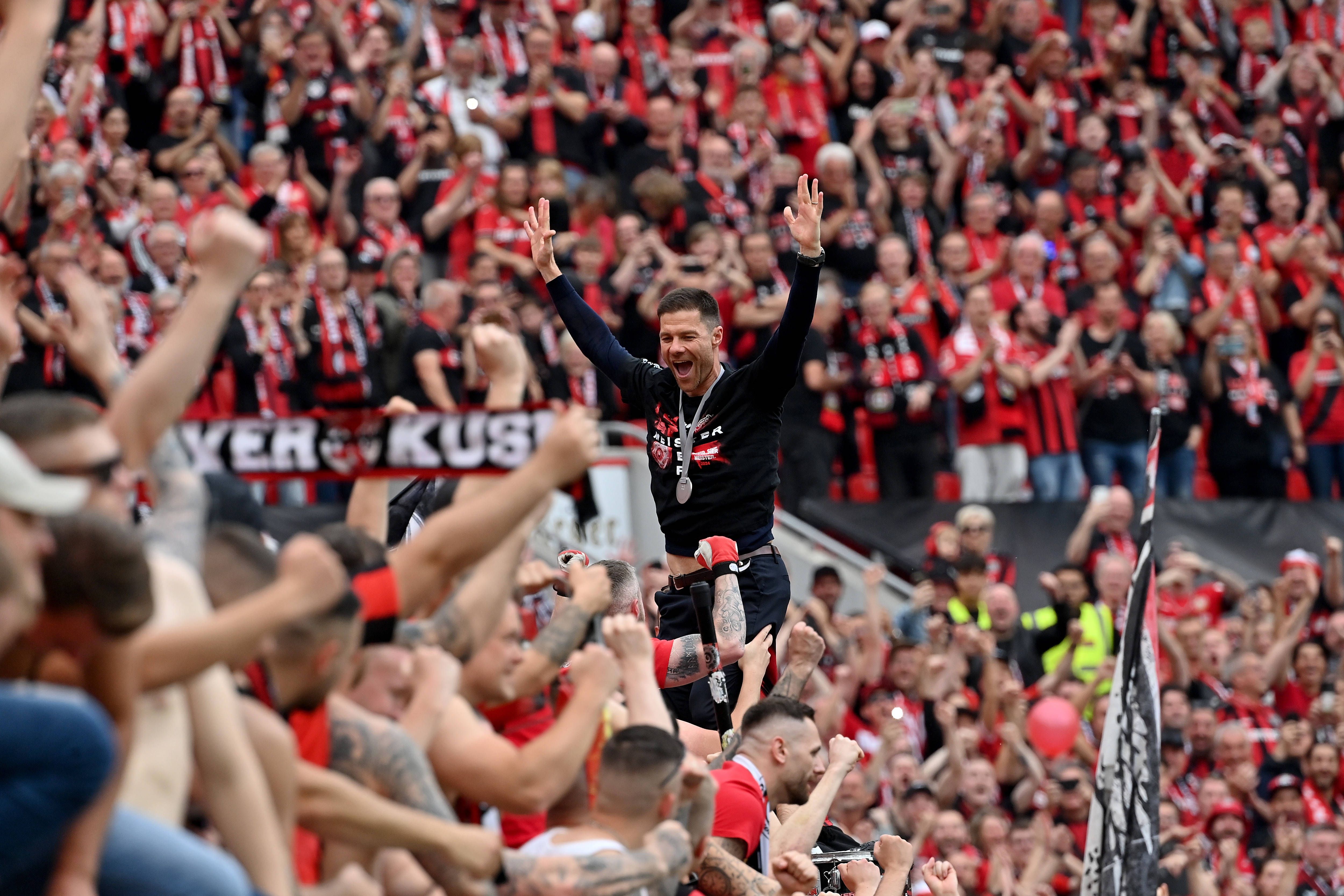 Xabi Alonso e Lucas Hradecky, treinador e capitão do Bayer Leverkusen, respetivamente, juntaram-se aos adeptos nas bancadas para festejar a conquista do primeiro título de campeão alemão.