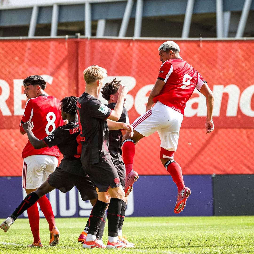 Aos 13 minutos Eduardo Fernandes cruzou em vez de rematar para uma baliza vazia, aos 29 Coletta atirou ao poste, um minuto depois um defesa desviou-lhe um remate. O perigo rondava a baliza alemã e aos 40 – pouco depois do primeiro e único remate dos alemães, aos 37 - Gonçalo Moreira arrancou pela área do Leverkusen adentro, após combinar com Francisco Silva, e voltou a bater Schlich.