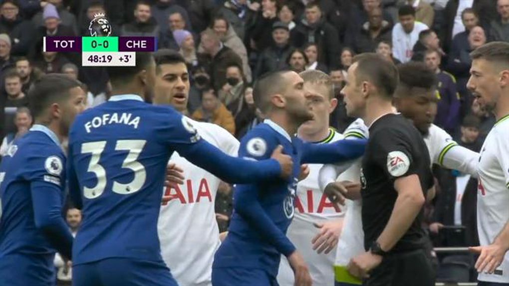 Emoções ao rubro no dérbi entre Tottenham e Chelsea. Ziyech tenta entrar em confronto com Richarlison, é empurrado pelas costas por Emerson Royal e acaba por responder com um estalo, tudo com o árbitro pelo meio. O marroquino vê cartão vermelho direto, mas depois de recorrer ao VAR, o árbitro corrige o castigo e mostra amarelo, apresentando cartão com a mesma cor ao brasileiro.